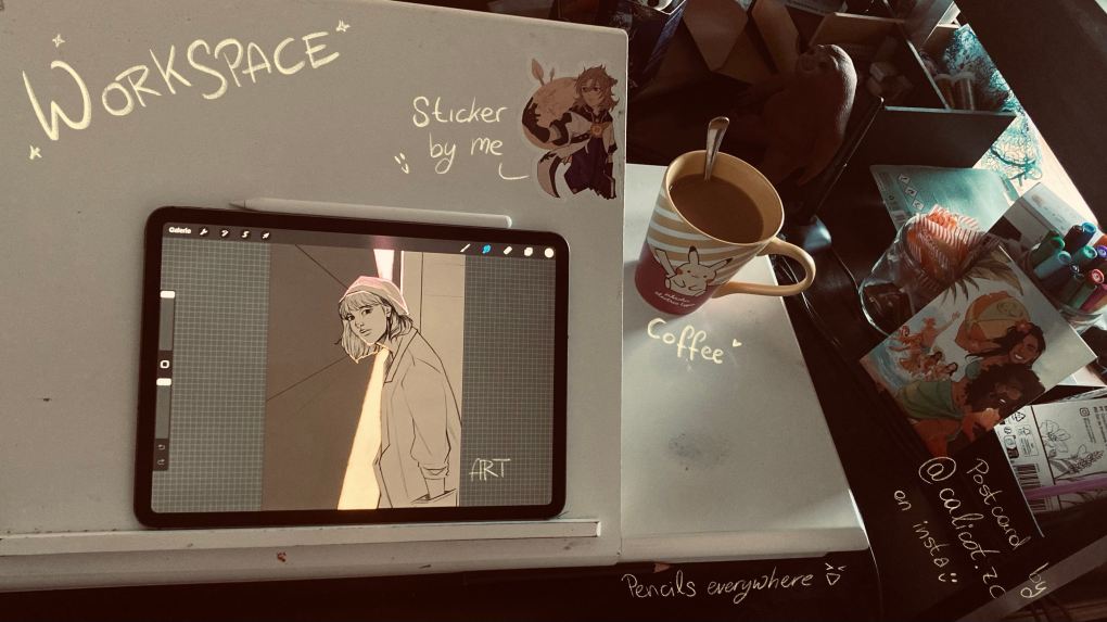 Today, I am mostly working on digital art but I am still enjoying traditional mediums. Just like my workspace, I am pretty flexible. Usually I sketch either on paper/ in my sketchbook or on my iPad + Procreate. Whenever I want to give my digital art some kind of a handdrawn look, I prefer the iPad. Whenever I work on bigger artworks, I prefer my XP-Pen tablet + Clip Studio Paint.